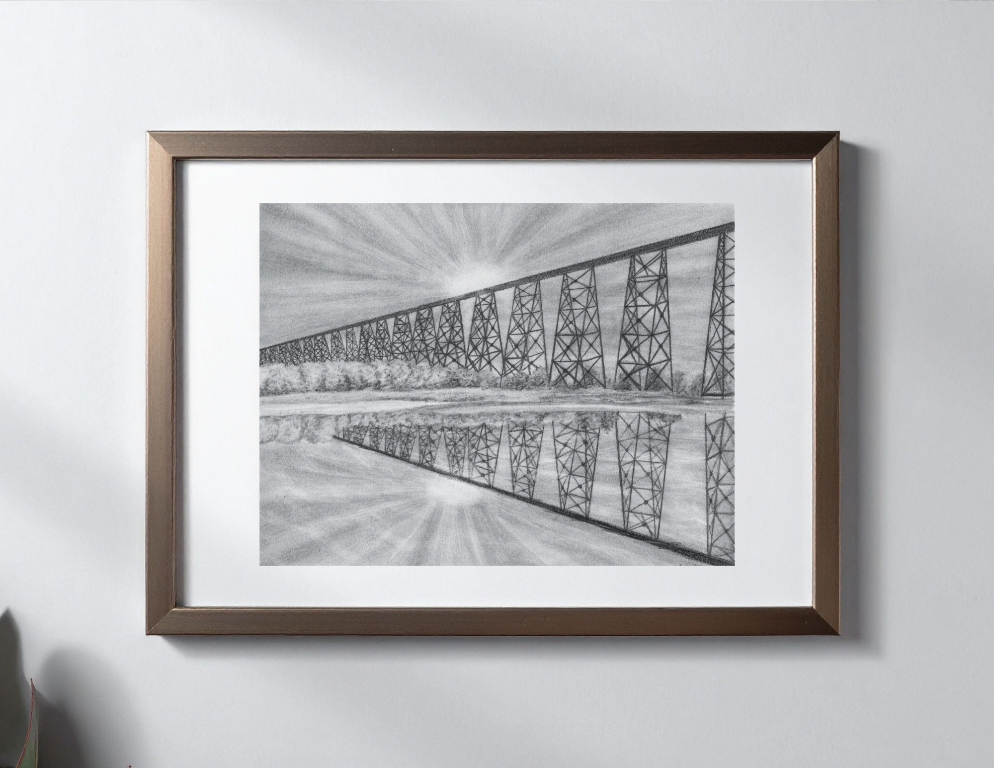 This drawing “Leth-bridge” depicts a scene of the high-level bridge in my home town Lethbridge. This bridge is actually the largest trestle railway bridge in the world and is over 100 years old! It is an icon for the city and a reminder of home for anyone who lives there. I drew this bridge and the river bottom with attention to detail and love!
