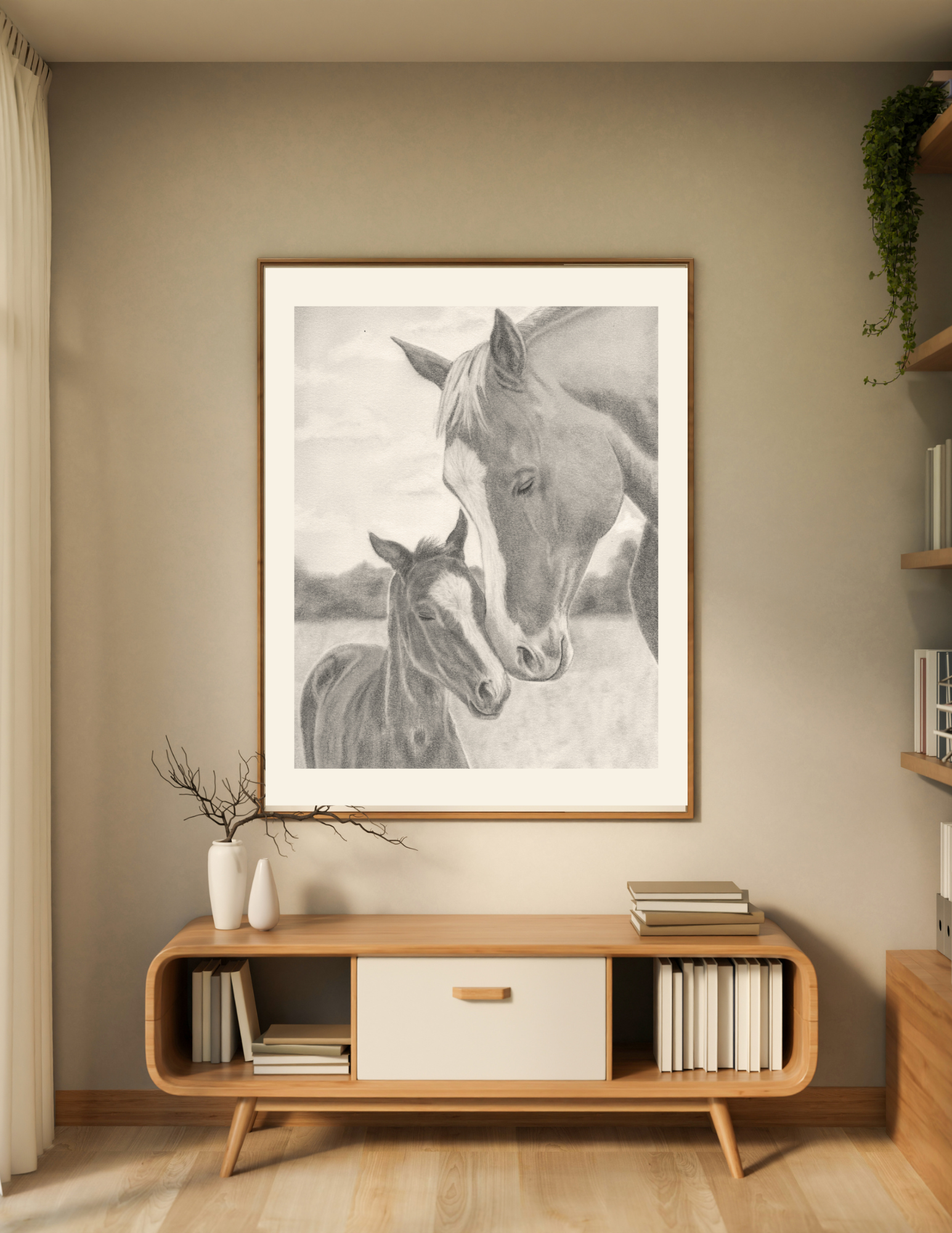 A print of my original graphite pencil drawing of a mare and her foal, created with patience and attention to every detail. This piece reflects the beauty of connection and calm found in nature, perfect for those who love horses, western themes, or meaningful artwork.